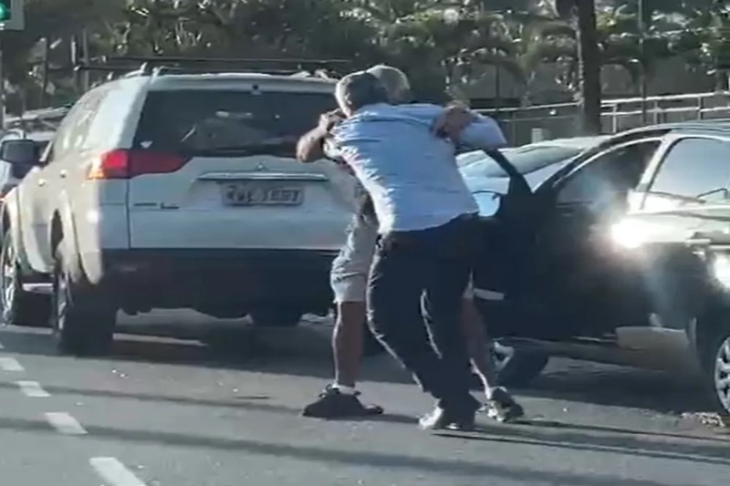 Os dois trocam socos, e Aldgeire chega a agredir o outro homem com o bastão que carregava. A briga aconteceu na Avenida Lúcio Costa, altura do Hotel Windsor. Algumas pessoas tentam apartar a briga.