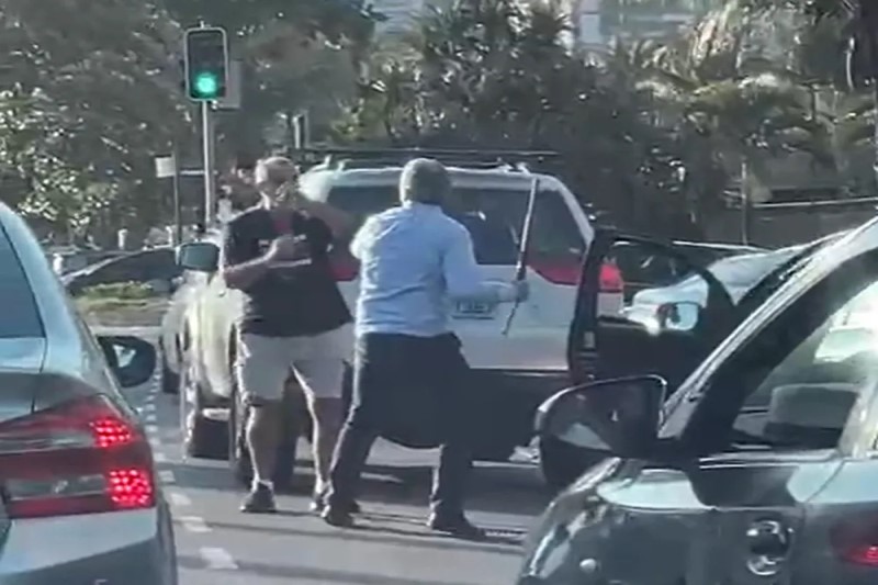 Ele sai do carro com um bastão na mão e troca socos com outro motorista