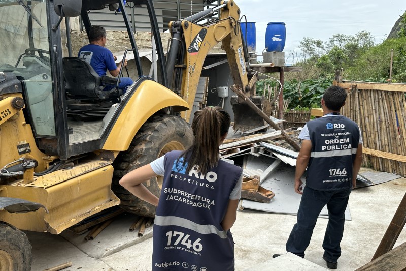 A Secretaria de Ordem Pública e a Subprefeitura de Jacarepaguá realizaram na manhã de hoje (24) uma operação de demolição de construção irregular na Avenida Engenheiro Souza Filho, no Rio das Pedras. No local, de aproximadamente 400 m², funcionava um bar com estrutura de madeira, além de duas tendas cobrindo mesas e cadeiras, todas em área pública e sem nenhuma autorização da Prefeitura. Num terreno ao lado, o dono do bar se apropriou cercando um espaço de 2 mil m² que servia como estacionamento. Ligações clandestinas de água e energia foram encontradas. Foram apreendidos 15 freezers, 23 mesas de madeira, 95 cadeiras, 10 mesas de plástico e um baú.
