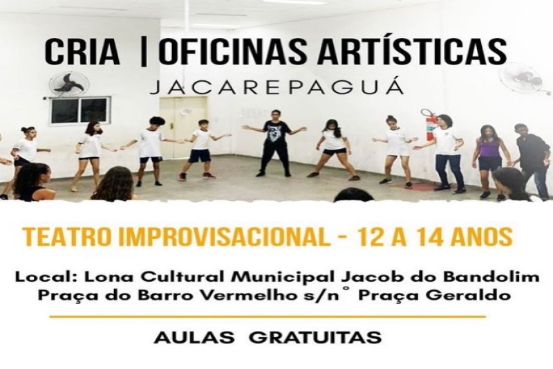 O Projeto Cria é uma ação cultural voltada para a educação e o desenvolvimento de jovens através do teatro. Pela primeira vez na Zona Oeste, a organização tem as inscrições liberadas para a Oficina de Teatro Improvisacional. As aulas são gratuitas e têm duas horas de duração, sendo ministradas às quartas-feiras (a partir das 16h30) e sextas-feiras (a partir das 13h), na Lona Cultural Jacob do Bandolim, em Jacarepaguá, até o dia 21 de julho. O foco da atividade é alcançar estudantes de 12 a 14 anos da rede pública.