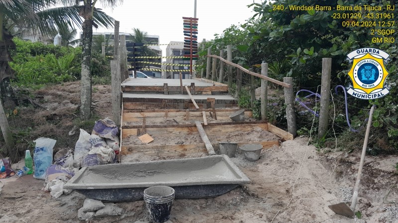 Na última terça-feira (09/04), equipes do Subgrupamento de Operações de Praia (SGOP) da Guarda Municipal do Rio (GM-Rio) uniram forças com a Subprefeitura da Barra da Tijuca para desmantelar uma estrutura irregular em construção na Av. Lúcio Costa, na altura do Posto 3, na Praia da Barra da Tijuca. A intervenção, denunciada por moradores, ocorreu devido à constatação de uma rampa de alvenaria sendo erguida ilegalmente junto à vegetação, próximo a um quiosque, em área de proteção ambiental.