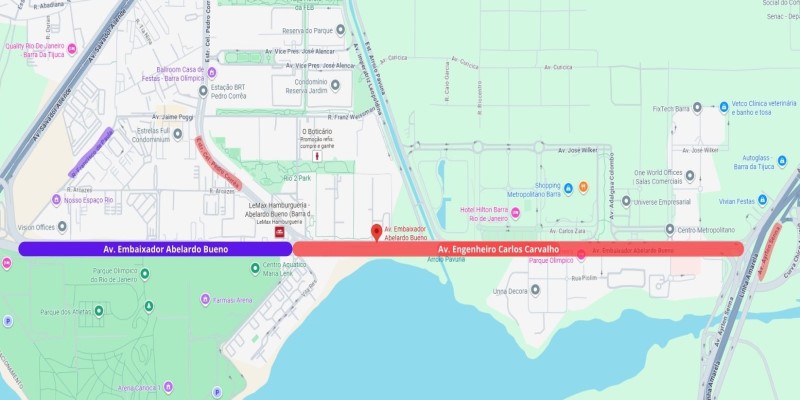 Com a alteração de 2,2 quilômetros, a Av. Embaixador Abelardo Bueno passa a ter início no cruzamento com a nova Av. Engenheiro Carlos Carvalho e segue até a Rua Francisco de Paula. A previsão é que, nos próximos dias, o município atualize a sinalização e cadastro dos endereços.