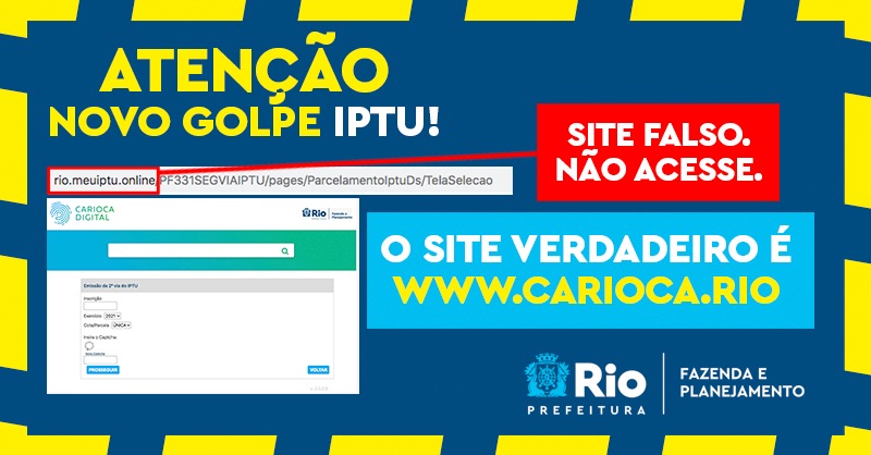 A Prefeitura do Rio de Janeiro identificou nesta quarta-feira (09/06) uma página fraudulenta que tenta se passar pelo portal Carioca Digital (carioca.rio) para emissão de boletos do IPTU. Os criminosos utilizam identidade visual semelhante ao portal oficial com o objetivo de aplicar golpes nos contribuintes que buscam fazer o pagamento das cotas mensais online. O usuário é direcionado para uma página onde é indicado a preencher o número da sua inscrição predial, o exercício e a parcela que deseja emitir para pagamento. O endereço falso utilizado pelos criminosos é http://rio.meuiptu.online/PF331SEGVIAIPTU/pages/ParcelamentoIptuDs/TelaSelecao .