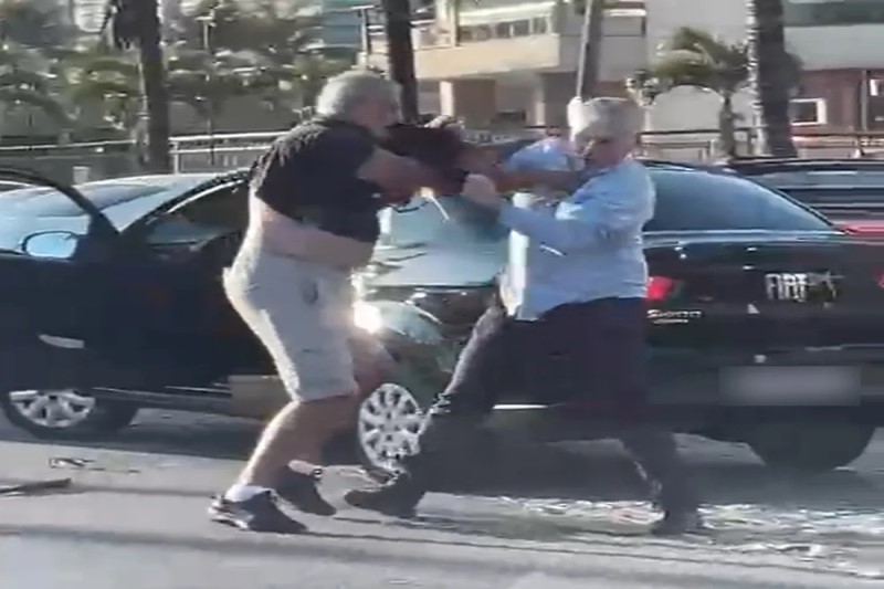 Ele sai do carro com um bastão na mão e troca socos com outro motorista