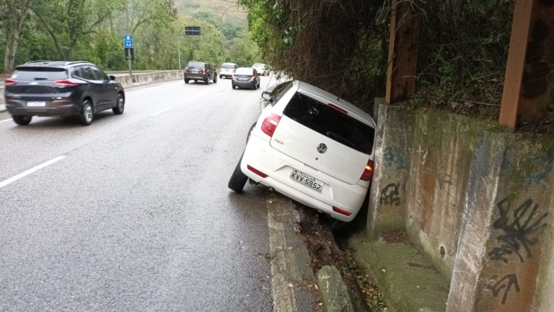 Um carro invadiu o acostamento e ficou com as rodas presas para fora da pista