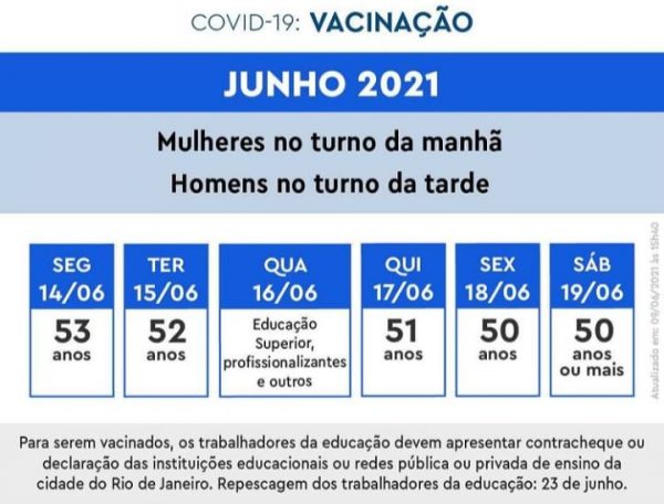 Na quarta-feira (16/06) da semana que vem, será a vez da vacinação dos trabalhadores do ensino superior, profissionalizante e outros. A repescagem para ambos os grupos acontecerá no dia 23 de junho. Na semana passada, a SMS anunciou a antecipação do calendário de vacinação do Rio. Após o dia reservado para os profissionais da educação básica, nesta quinta-feira (10/06) serão imunizadas pessoas de 55 anos; e na sexta (11/06), pessoas de 54 anos. No sábado (12/06) haverá repescagem para cariocas com 54 anos ou mais e para pessoas com comorbidades ou deficiência a partir de 18 anos.