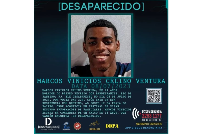 Marcos Vinícios Celino Ventura, de 21 anos, e um amigo foram vistos pela última vez na madrugada de sábado