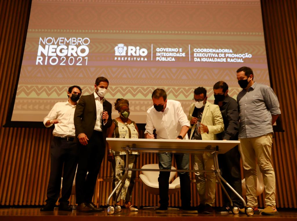 O prefeito do Rio, Eduardo Paes, e o secretário municipal de Governo e Integridade Pública, Marcelo Calero, anunciaram, nesta terça-feira (30/11), o edital Territórios Antirracistas, que irá destinar R$ 200 mil a projetos de combate ao racismo. A iniciativa, desenvolvida pela Coordenadoria Executiva de Promoção da Igualdade Racial (Cepir), foi apresentada durante o evento de encerramento do Novembro Negro Rio 2021, no Museu do Amanhã, na Praça Mauá, no Centro.