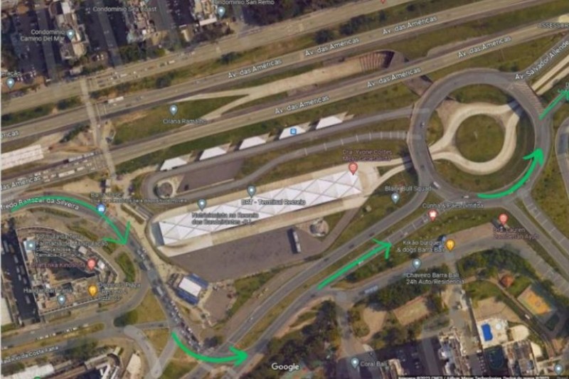 Rota 1: Veículos com destino à Av. Salvador Allende deverão acessar a pista lateral da Av. das Américas, logo após a estação Guignard e seguirem pela rotatória do Terminal Recreio.