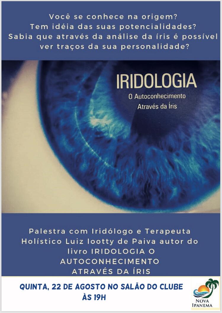 Acontece nesta quinta-feira (22), a palestra Iridologia - O Autoconhecimento Através da Íris. O iridólogo e terapeuta holístico Luiz Iootty de Paiva, autor do livro de mesmo nome, irá explicar o estudo da íris, como é possível usá-la para autoconhecimento, entender traços da personalidade, para aprimorar potencialidades e até diagnosticar alguma questão física. O evento irá ocorre no salão do clube do condomínio Nova Ipanema (Av. das Américas, 4567), às 19h. A entrada é gratuita.