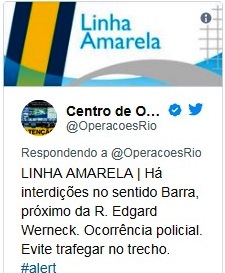 Um intenso tiroteio na Cidade de Deus interditou mais uma vez a Linha Amarela na tarde desta quarta-feira (24). O Centro de Operação da Prefeitura informou que há bloqueios na via no sentido Barra, próximo à Rua Edgard Werneck. Policiais do Batalhão de Choque, da Unidade de Polícia Pacificadora (UPP) e do 2º Comando de Policiamento de Área (CPA) estão na comunidade.