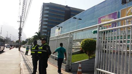 Policiais do 31º Batalhão de Polícia Militar - PMERJ fazem reforço em frente ao supermercado Guanabara, na Avenida das Américas. O 67 º aniversário da rede Guanabara já faz parte da rotina anual do carioca e atraí milhares de pessoas, devido a preços baixos e diversas promoções. Todo ano, centenas de vídeos viralizam nas redes sociais mostrando pessoas correndo em direção ao interior do supermercado em busca dos estoques mais requisitados.