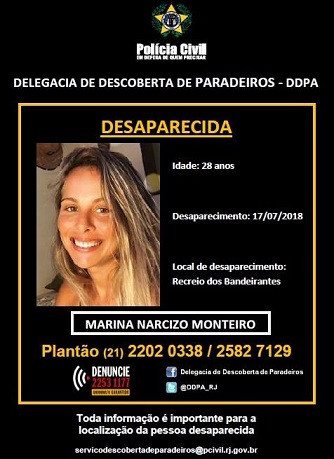 Marina Narcizo Monteiro, de 28 anos, desapareceu no dia 17 de julho, pela manhã.