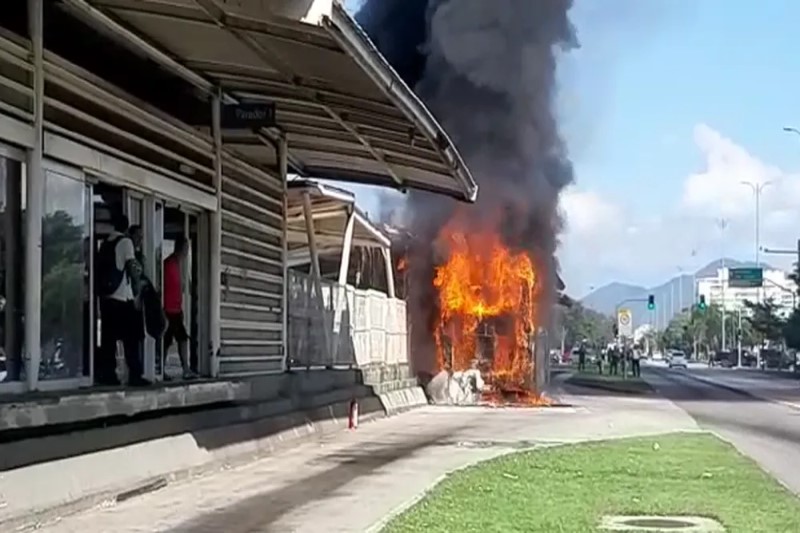 Veículo pegou fogo no sentido Santa Cruz. Pista central da Avenida das Américas está interditada