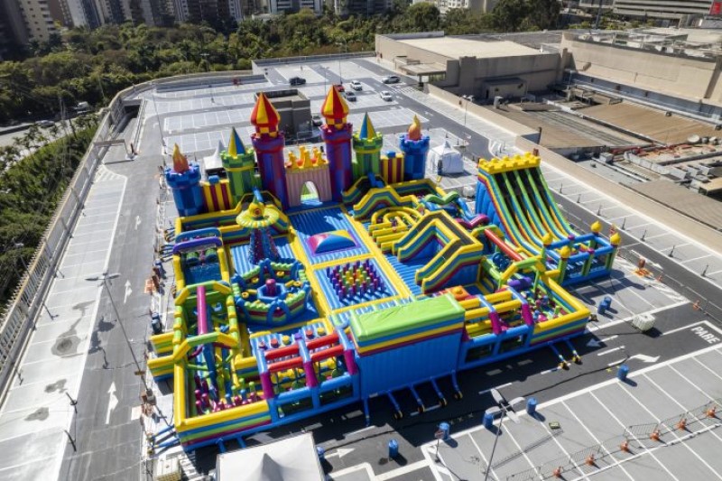 Com escorregadores e estruturas gigantes, o "Jump Around" ocupa uma área de 2.500m² no estacionamento do Shopping Via Parque, na Barra
