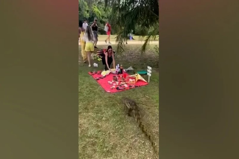 Animal sai de lago e vai, lentamente, em direção a um grupo que está com comidas e bebidas