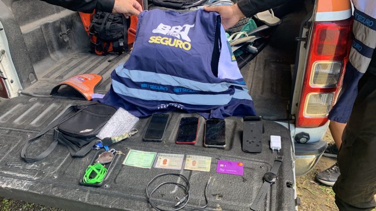 Ao avistarem os policiais, os dois suspeitos tentaram fugir. Um deles foi detido por agentes do BPVE que passavam pelo local. O outro tentou fugir pela mata e foi preso pelos agentes do programa BRT Seguro. Com os detidos, os policiais encontraram dois celulares e uma bolsa contendo diversos pertences da vítima, como documentos, cartão de crédito e um relógio.