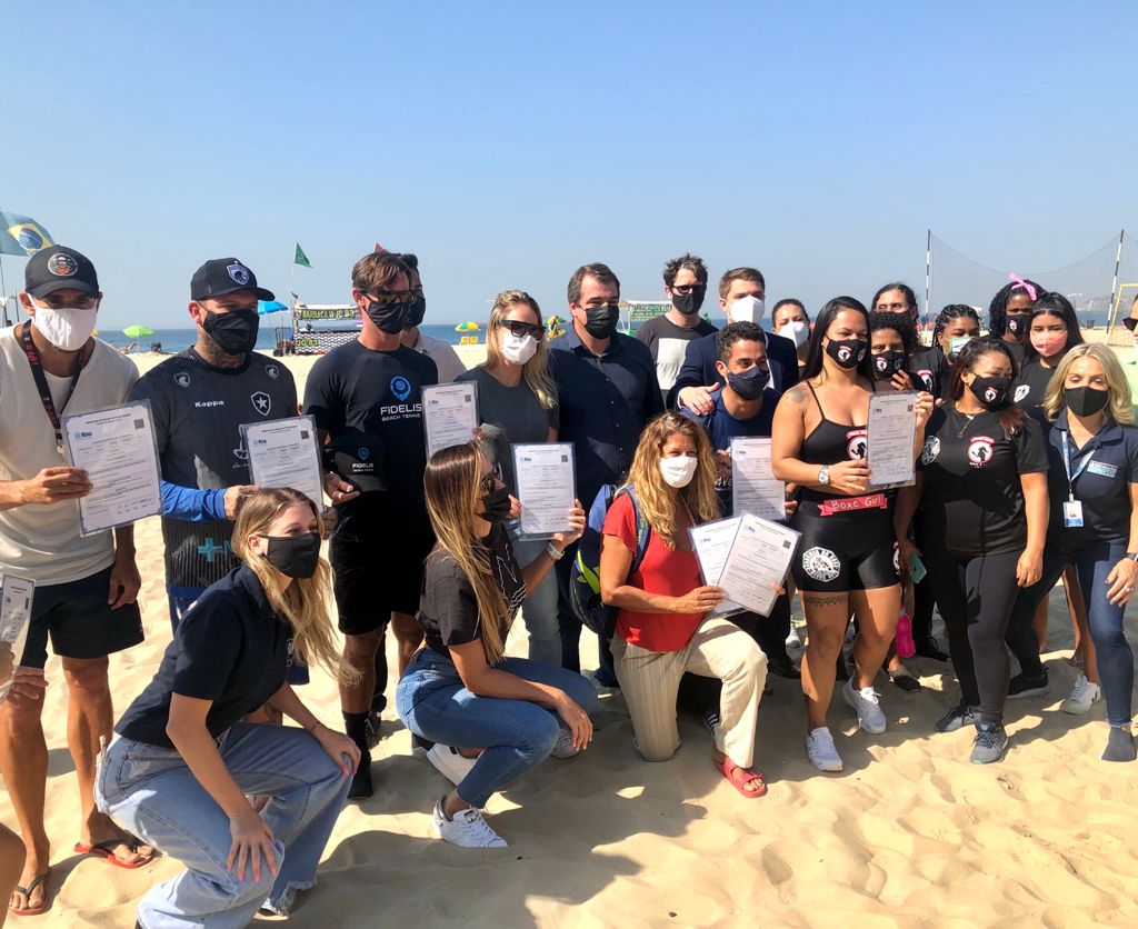 Dando continuidade ao ordenamento urbano das atividades esportivas na orla do Rio por parte da prefeitura, os secretários Guilherme Schleder (Esportes) e Brenno Carnevale (Ordem Pública), junto com a subprefeita da Zona Sul, Ana Ribeiro, e representantes da Coordenadoria de Controle Urbano (CCU) e da Guarda Municipal, estiveram na praia de Copacabana nesta quarta-feira (25/08) para entregar mais 15 alvarás de licenciamento. O documento regulariza o uso da área pública para a prática de futevôlei, natação, beachboxing, stand up e crosstrainer.