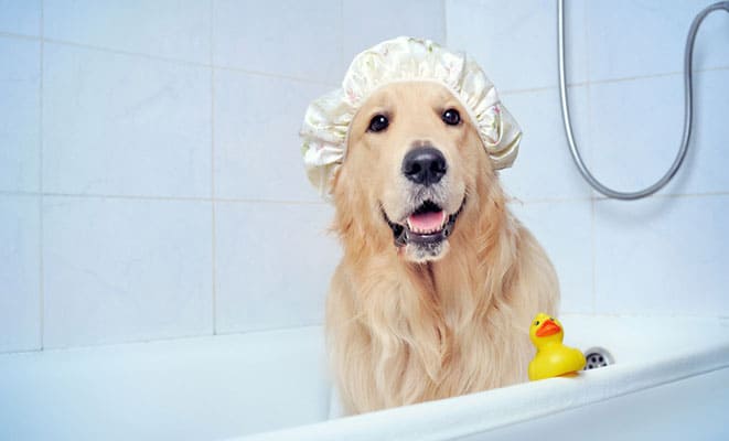 3. Deixe o produto agir por alguns minutos e enxágue bem com água. A dica é deixar a lavagem da cabeça por último, já que o pet provavelmente a agitará para secá-la.